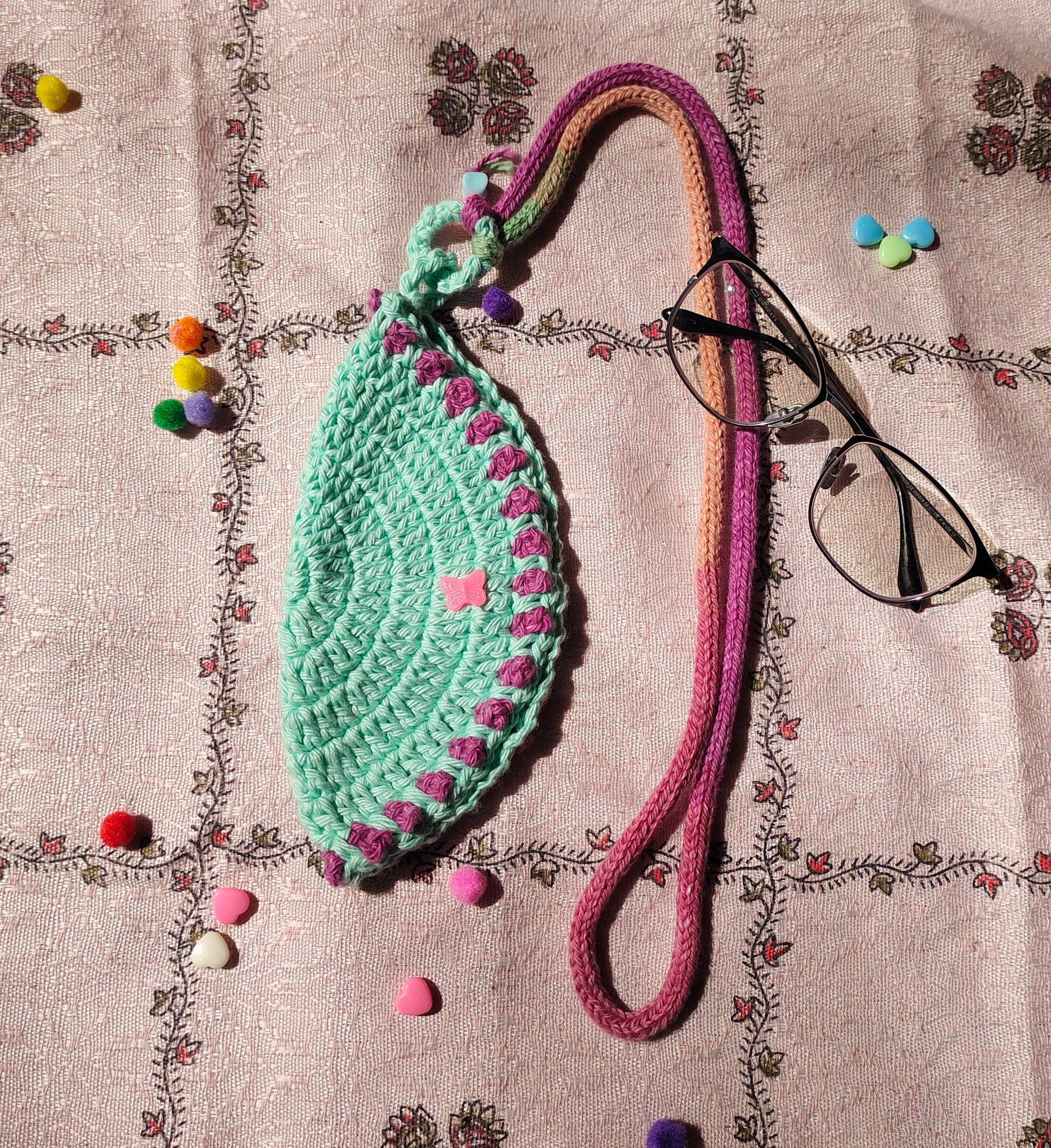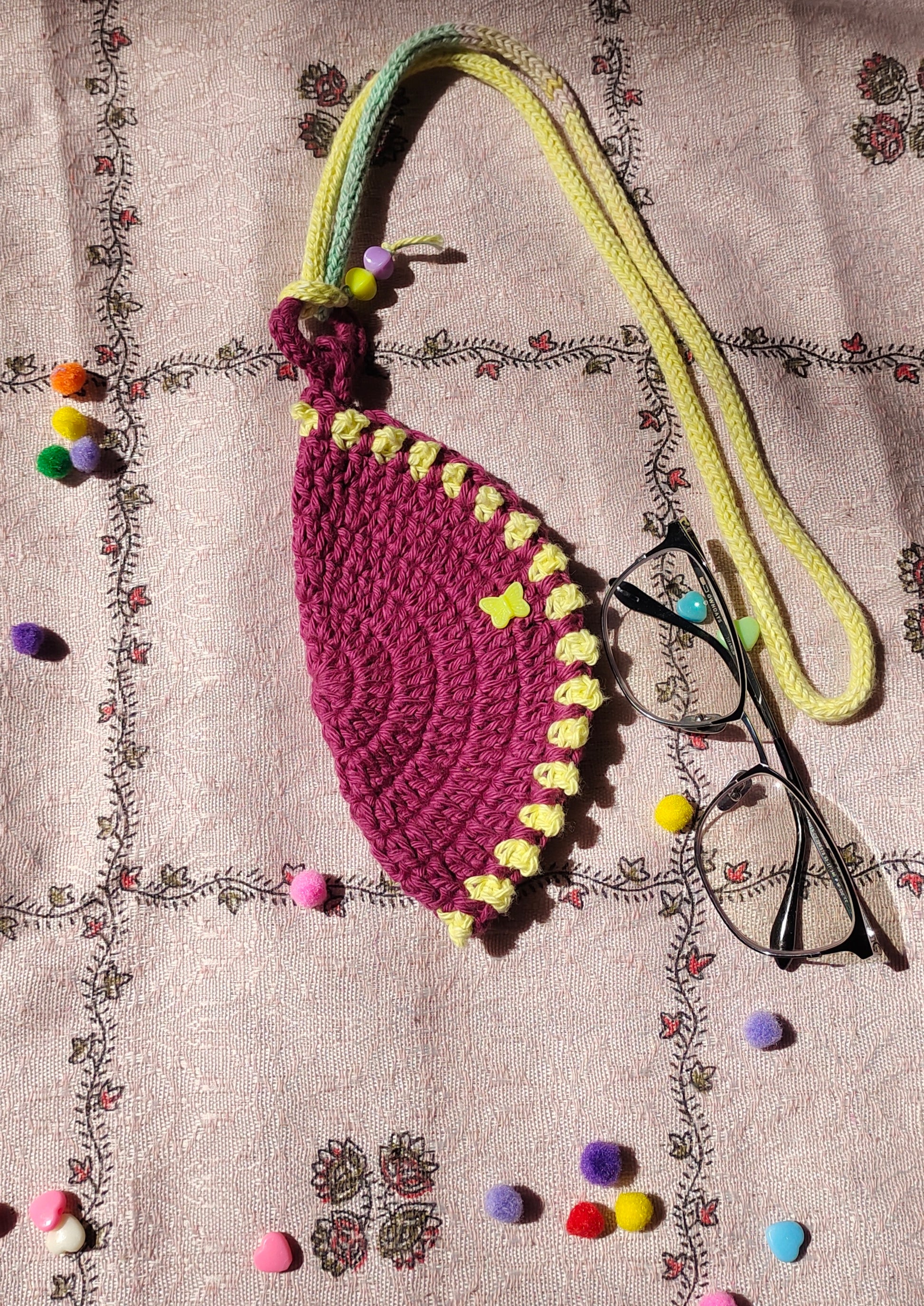 Handmade Crochet Wearable Glasses Pouch with Neck Cord & Butterfly Charm. Round case made with cotton yarn. Soft, stylish and protective with button closure. Perfect for travel and gifting.