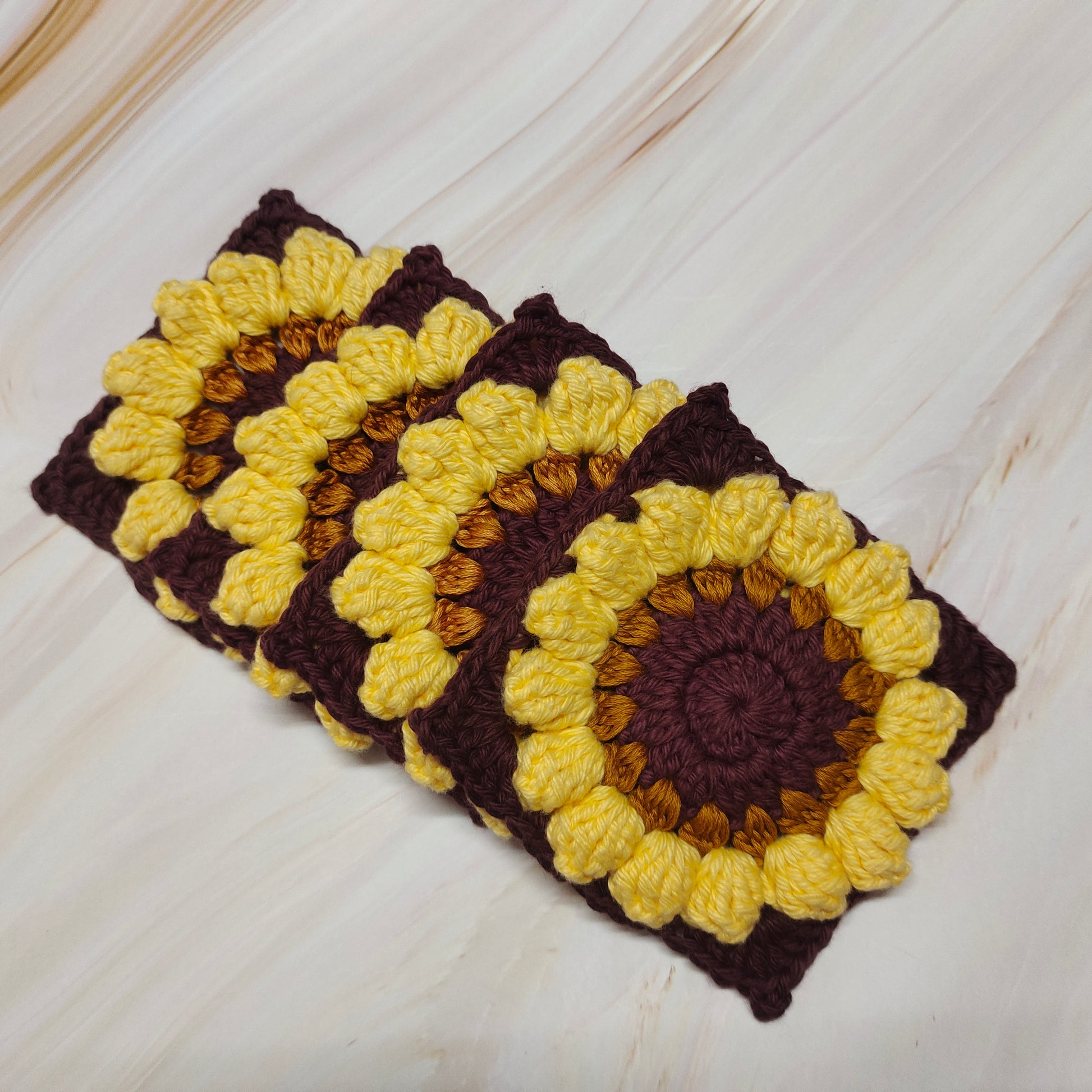 Crochet sunflower square coasters : perfect for tea & coffee cups.